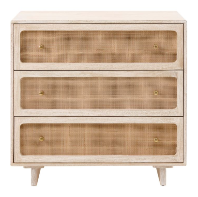 This premium wooden chest of drawers is crafted from solid wood & Cane in a White Wash finish, offering both style and functionality.